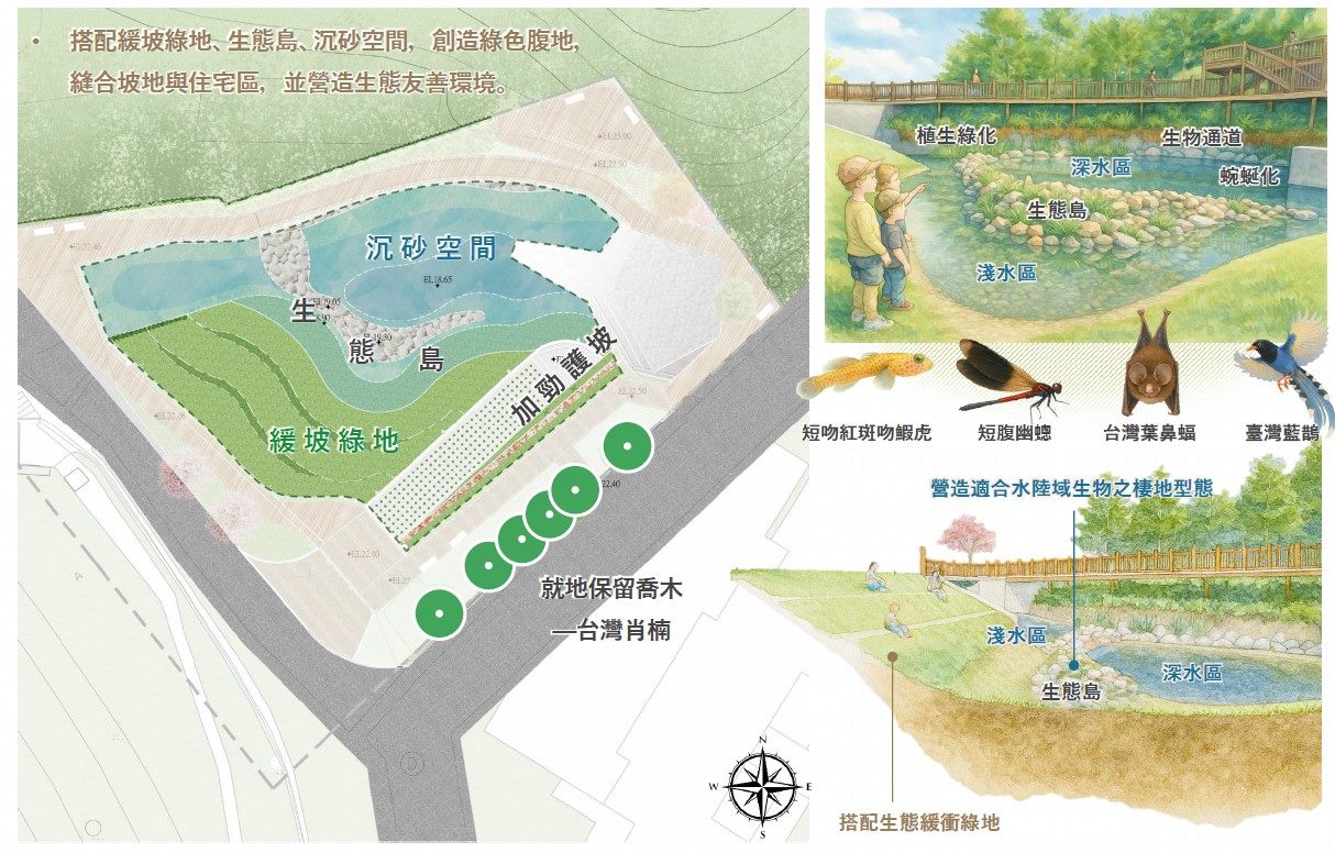 本計畫以「湖光山色、溪谷情、步道綠意慢遊憩」為主題,兼顧防洪安全、生態永續與社區休憩三大面向,打造一座具備多功能的防災沉砂池。